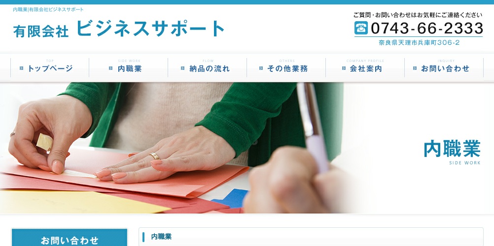 天理市にある内職や手作業のさまざまなサポート業務を主に行っている会社になります。仕事内容はダイレクトメールの封入作業やプラスチック製品のバリ取りなど手作業全般となっているようです。引き取りや納品の仕方など詳しいことは掲載されていないので直接問い合わせの上確認してください。