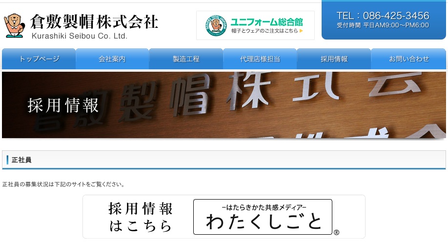 公式サイトへ「倉敷製帽株式会社」の内職について、ホームページの記載内容から、オススメできそうか(安心できそうか)を在宅ワークガイド・スタッフが独自にチェックしました。(2016年1月17日チェック)