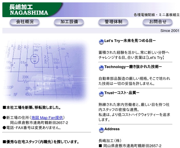 公式サイトへ「長嶋加工株式会社」の内職について、ホームページの記載内容から、オススメできそうか(安心できそうか)を在宅ワークガイド・スタッフが独自にチェックしました。(2016年1月17日チェック)