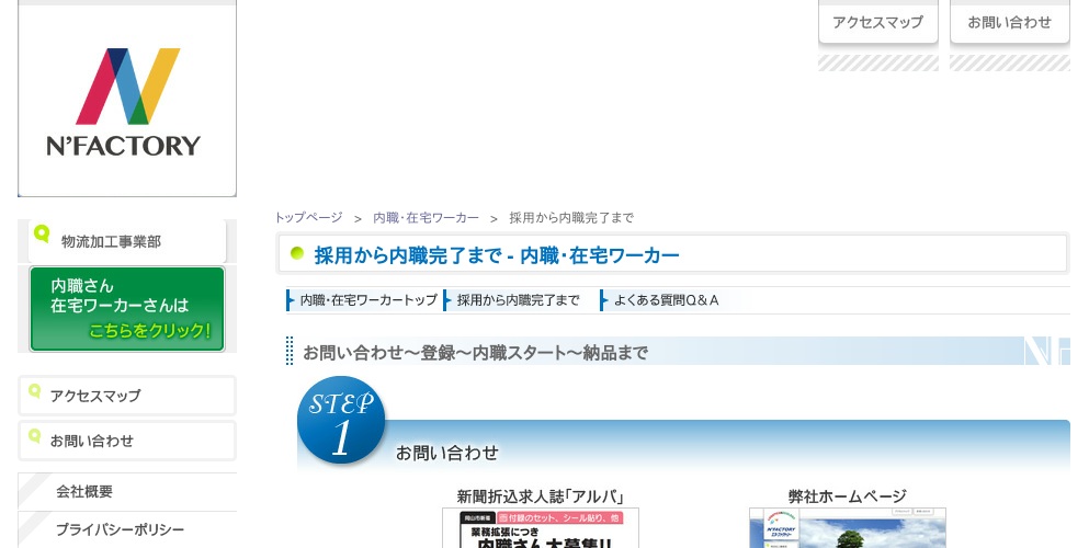 公式サイトへ「株式会社エヌ・ファクトリー」の内職について、ホームページの記載内容から、オススメできそうか(安心できそうか)を在宅ワークガイド・スタッフが独自にチェックしました。(2016年1月17日チェック)