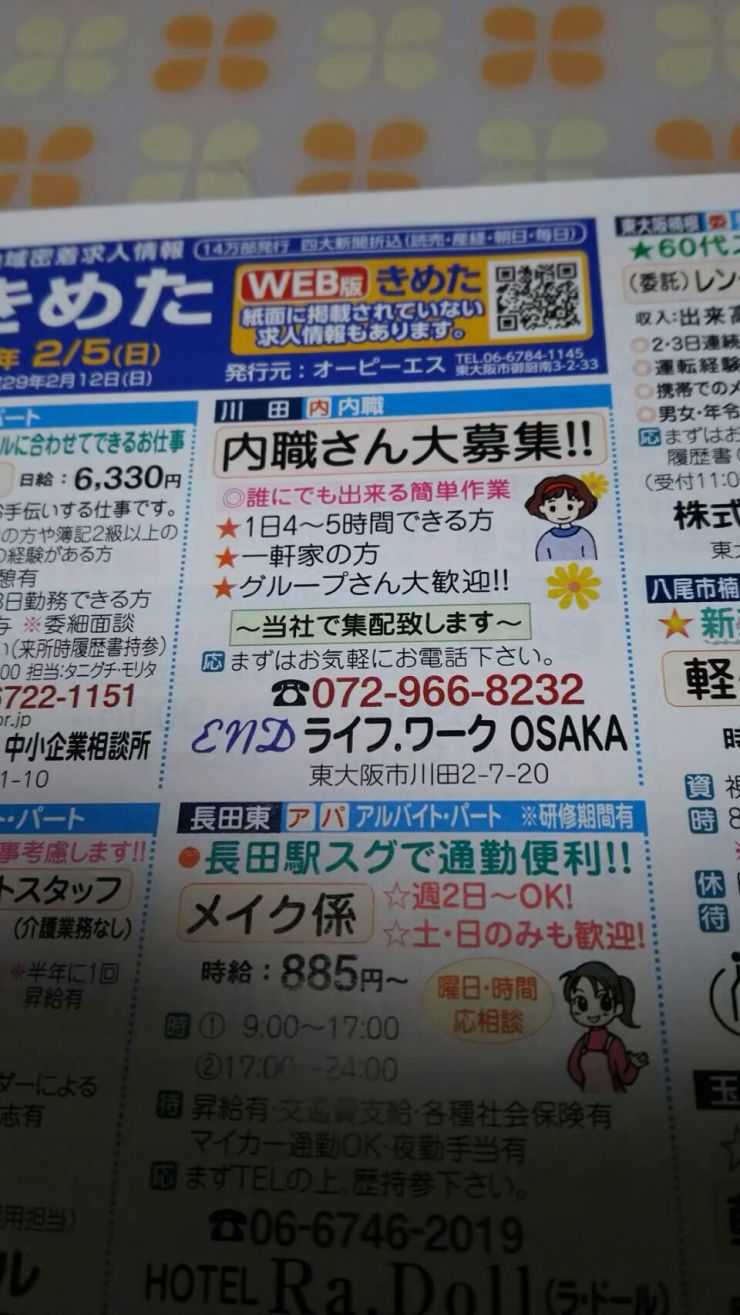 大阪東部に特化した求人サイト!内職情報が豊富!「きめた」