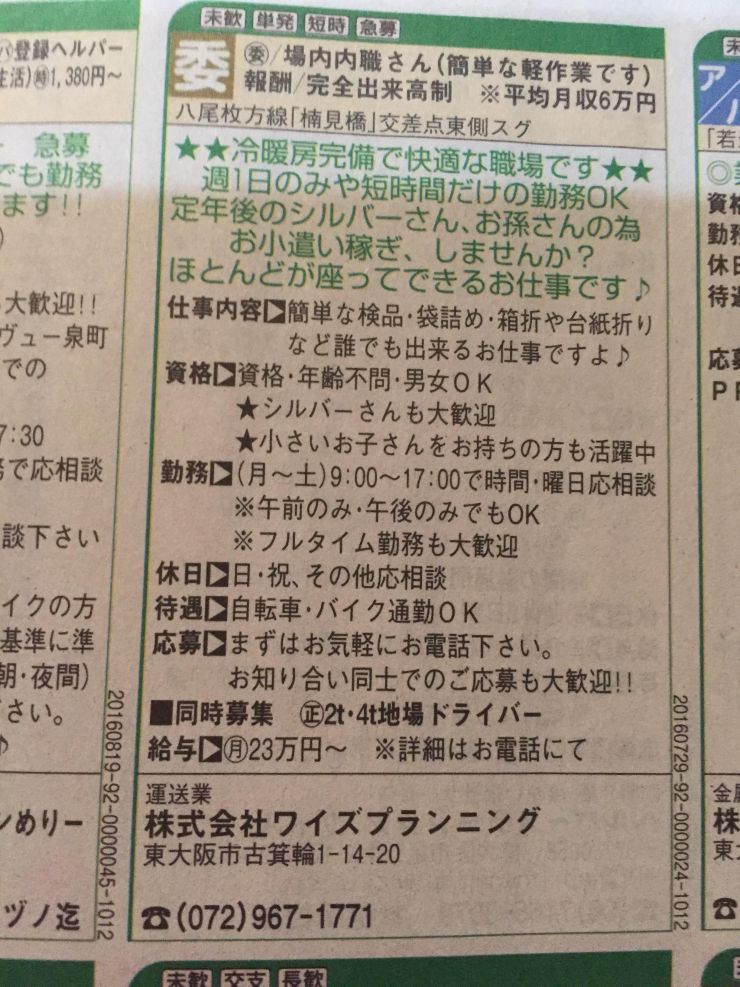 東大阪市にある物流加工から保管、輸送までを代行している会社になります。作業内容は包装作業ができる方を積極的に募集しているようです。集配送は会社が行ってくれるので自家用車をお持ちでない方でも応募が可能です。詳しい作業内容や作業時間などは掲載されていないので電話にて確認が必要になります。