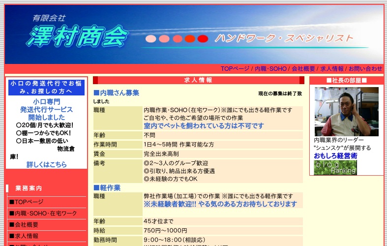 公式サイトへ「有限会社 澤村商会」の内職について、ホームページの記載内容から、オススメできそうか(安心できそうか)を在宅ワークガイド・スタッフが独自にチェックしました。(2015年12月8日チェック)