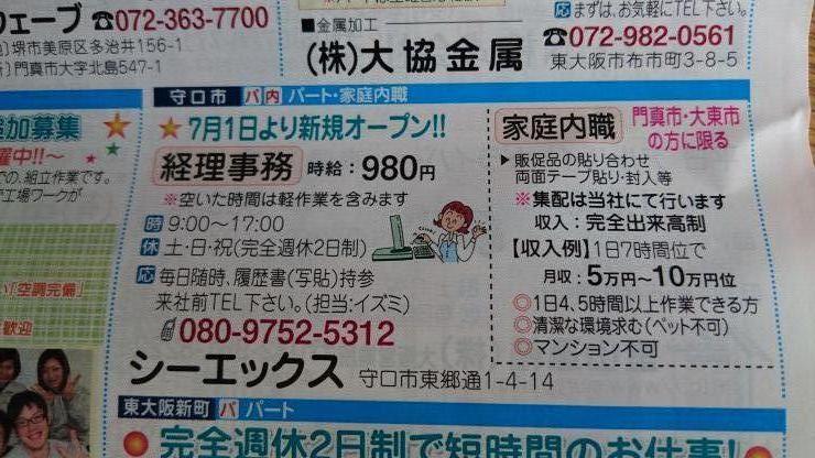 ユーザから投稿してもらった守口市の内職チラシ情報を公開しています。