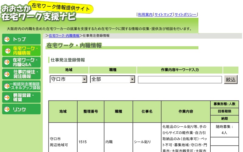 大阪市にある大阪府の公的サイトになります。大阪府内の内職に関する情報提供や相談などを行っています。地域別に検索することができ、守口市の情報も掲載されています。守口市で内職を希望している方はまずこちらのサイトを参考にすると良いと思います。