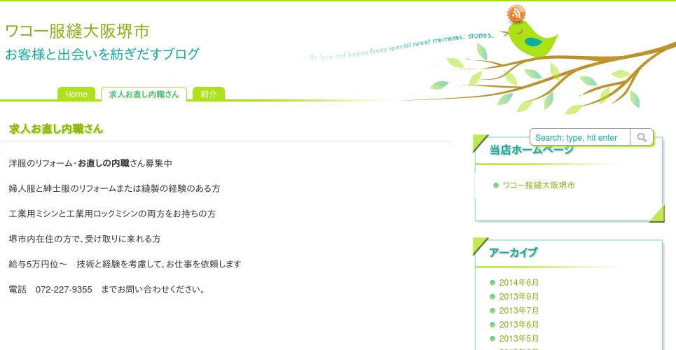 公式サイトへ「ワコー服縫大阪堺市」の内職について、ホームページの記載内容から、オススメできそうか(安心できそうか)を在宅ワークガイド・スタッフが独自にチェックしました。(2015年12月8日チェック)