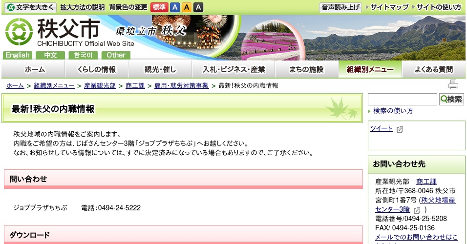 秩父市の公式サイトに掲載されているジョブプラザちちぶのページになります。ジョブプラザちちぶでは秩父地域の内職に関する情報提供や相談受付、あっせんなどを行っています。ホームページからは最新の内職情報がダウンロードできるなど便利なページになっていると思います。