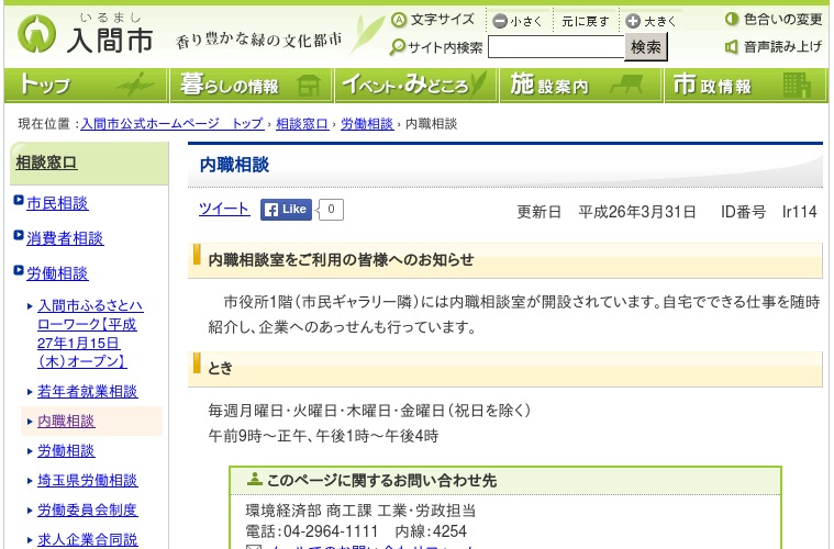 入間市の内職に関する相談窓口になります。インターネットでの情報についての閲覧などは行っていませんが来室にて相談やあっせんを受け付けています。直接相談が可能なので初めて内職を始める方や相談しながら自分に合った仕事を見つけたいという方には便利な窓口になっていると思います。