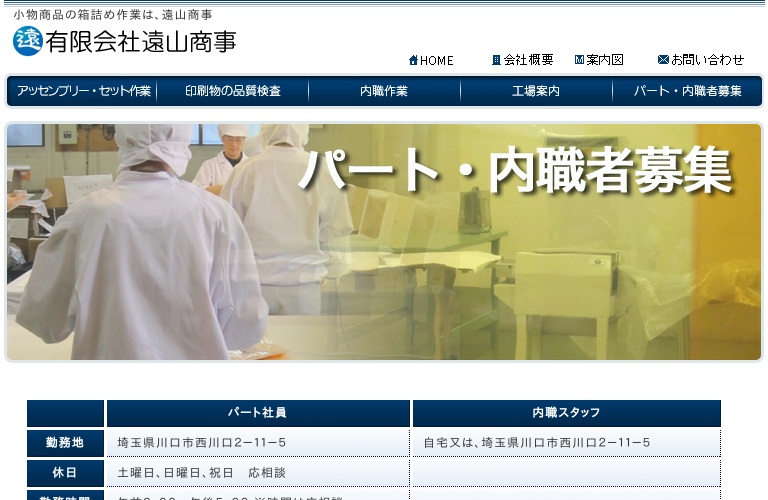 公式サイトへ「有限会社 遠山商事」の内職について、ホームページの記載内容から、オススメできそうか(安心できそうか)を在宅ワークガイド・スタッフが独自にチェックしました。(2016年1月17日チェック)