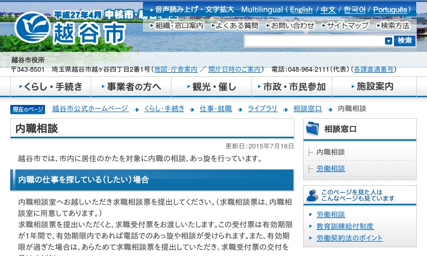 越谷市が運営する越谷市産業雇用支援センターの内職相談室になります。越谷市に在住の方を対象に来室や電話にて求人情報の提供や相談、あっせんを行っています。直接相談できるのでこれから内職を始めようという方やどういった仕事が自分に向いているのか相談したいという方にはとても心強い相談先だと思います。