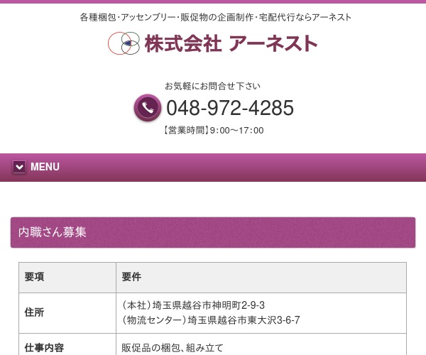 公式サイトへ「株式会社 アーネスト」の内職について、ホームページの記載内容から、オススメできそうか(安心できそうか)を在宅ワークガイド・スタッフが独自にチェックしました。(2016年1月17日チェック)