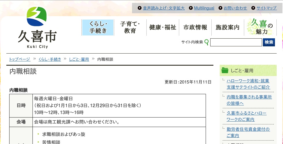 久喜市が行っている内職相談になります。インターネットで求人情報の閲覧などは行えませんが、電話か来場にて内職に関する情報提供や相談、あっせんを行っています。会場は商工観光課に問い合わせる必要があります。