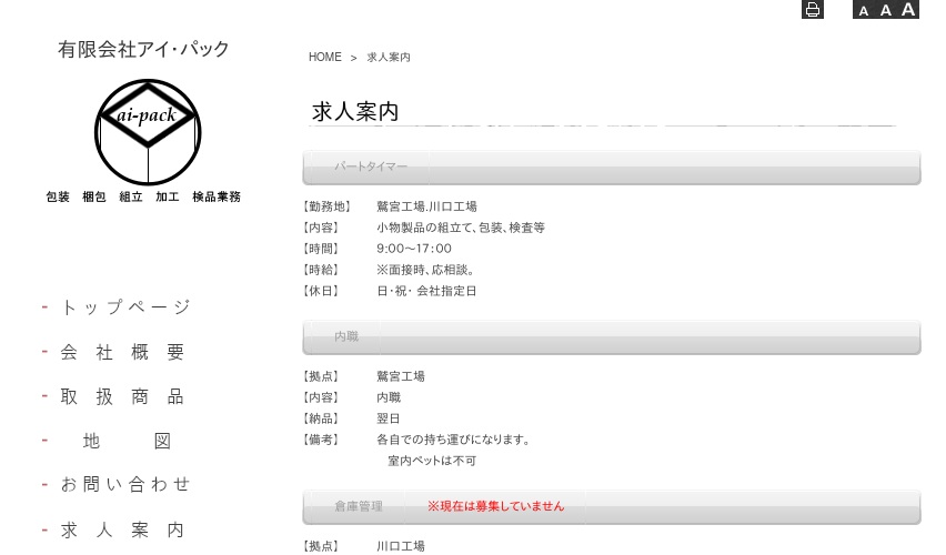 公式サイトへ「有限会社アイパック」の内職について、ホームページの記載内容から、オススメできそうか(安心できそうか)を在宅ワークガイド・スタッフが独自にチェックしました。(2016年1月17日チェック)