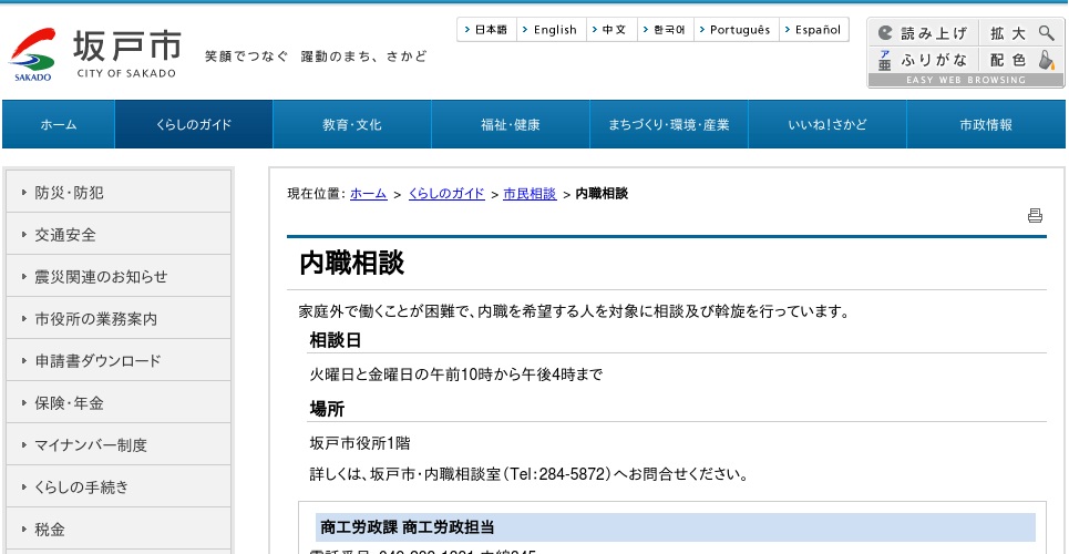 坂戸市では坂戸市役所に市民に向けた内職相談窓口を開設しています。インターネットでの求人情報の閲覧はできないので、直接来室する必要があります。予約や利用する際の登録の必要など詳しいことは電話で問い合わせて確認の上利用してください。