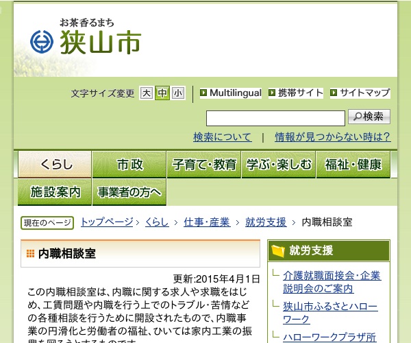 狭山市の公式サイトに掲載されている内職相談室の情報になります。インターネットでの求人情報の閲覧などはできませんが、窓口で求職者の方に対する相談やあっせんを行っています。直接相談できるので初めて内職を恥じようとする方でも安心して探すことができると思います。