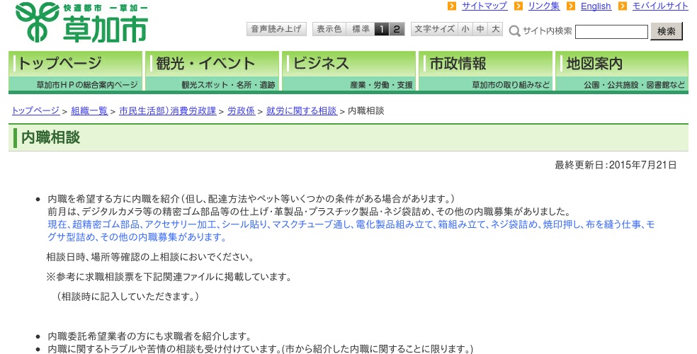 草加市が運営する内職についての相談窓口になっています。インターネットでの求人情報の閲覧などは行っていないので、来所にて求人情報の提供を受ける必要があります。相談場所や日時が曜日によって異なるので利用する際は確認の上来所してください。