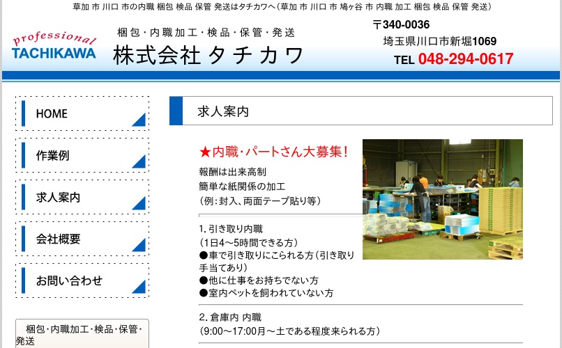公式サイトへ「株式会社 タチカワ」の内職について、ホームページの記載内容から、オススメできそうか(安心できそうか)を在宅ワークガイド・スタッフが独自にチェックしました。(2016年1月17日チェック)