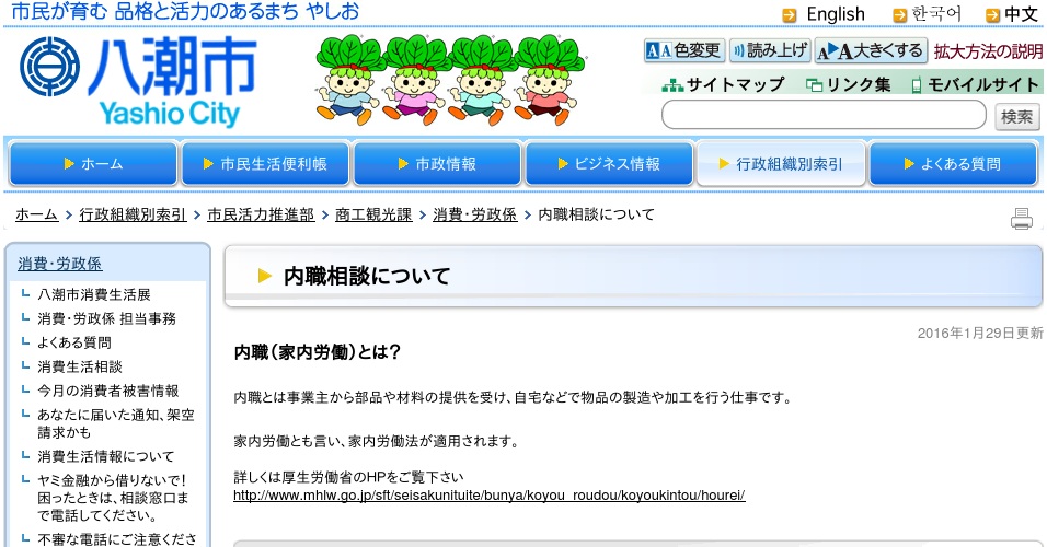 八潮市では市内にお住まいの方を対象に市役所の市民相談室にて内職についての情報提供やあっせん、相談受付などを行っているようです。来庁や電話での問い合わせのほかにもホームページにも求人情報のリンクが掲載されているので気軽に探すことが出来ると思います。