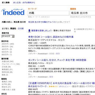 沢山の求人情報を一気に見たいという方におすすめの「indeed」。求人サイトの枠を越えて色々な情報を集めて表示してくれます。吉川市と内職というキーワードで検索をすると、仕上げ作業、事務、電話対応、シール貼り、封入作業などの募集が、在宅ワークというキーワードだとネット販売、データ入力、タイピングなどの募集が見つかります。掲載元の求人サイトが分かるので、そのサイトからさらに検索をしてみるのもいいですね。