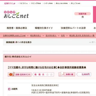 主婦や主夫の方向けに作られている求人サイト「リビングおしごとネット」。このサイトで吉川市の在宅ワークを探すと会計事務所の経理スタッフの募集が見つかります。仕事ごとにおすすめの度合いを星の数で表しているのが分かりやすいですね。仕事の詳細を見ると職場の特徴がグラフ状に表示されています。視覚的に分かりやすく参考になります。採用されるとお祝い金がもらえるので、同じお仕事に応募するならこちらのサイトを利用する方がお得ですよ。
