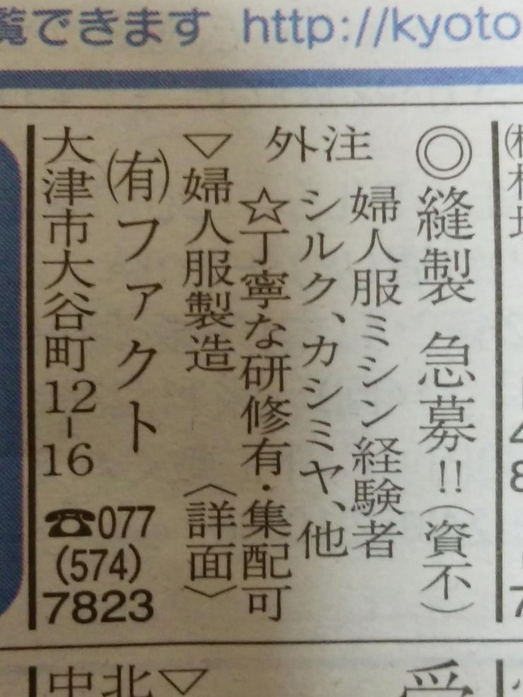 婦人服(シルク、カシミヤ、他)縫製の内職の求人です。婦人服ミシン経験者の募集となっています。資金不要です。