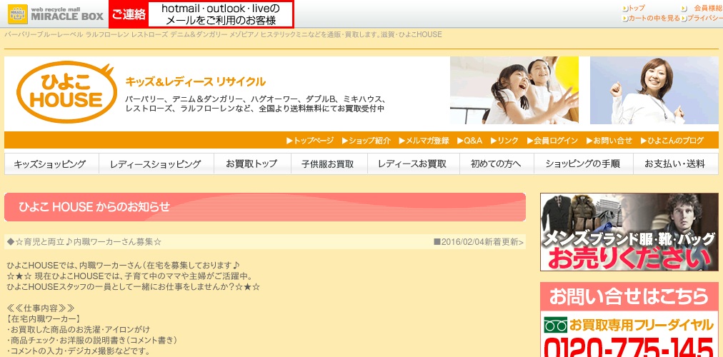草津市にある子供服や婦人服のリサイクルショップになります。仕事内容は買い取りした商品の洗濯からアイロン掛け、商品チェック、コメント書きやデジカメ撮影などホームページへ商品を掲載する一連の作業となっているようです。都合の良い時間に作業が可能なので小さいお子さんをお持ちの方や主婦の方に向いている仕事だと思います。