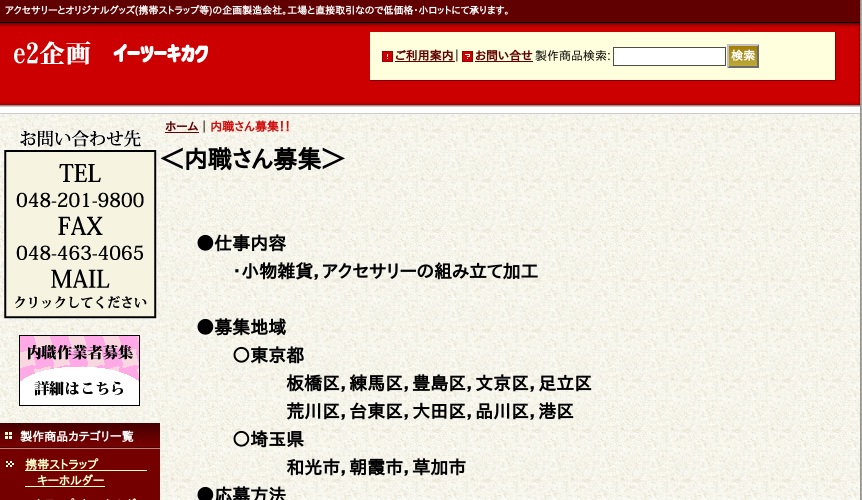 埼玉県和光市のアクセサリーやグッズ等の企画製造会社。板橋区を含む13の市区で内職者を募集している。 主な作業内容は、小物雑貨やアクセサリーの組み立て加工である。キーホルダーやストラップなどの小物を組み立てる作業のため、細かい作業が得意な方に向いている内職である。