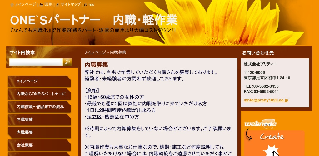 公式サイトへ「One`sパートナー(株式会社プリティー)」の内職について、ホームページの記載内容から、オススメできそうか(安心できそうか)を在宅ワークガイド・スタッフが独自にチェックしました。(2016年10月22日チェック)