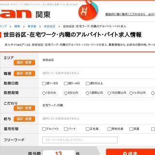 「バイト探しは」のフレーズでおなじみのanのサイトです。世田谷区では「アンケートモニター」、「美容モニター」、「ミステリーショッパー」の求人が多数あります。気になった仕事は「とりあえず保存」ボタンを押しておくとあとから見直すことができて便利です。また、「まとめて応募する」という複数の仕事に一括して応募できるボタンがあるので、ぜひそれを活用してみてください。モニター系の仕事は多く登録しておくと回ってくる案件が増えて効率的に仕事ができます。