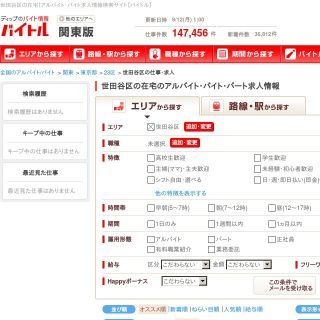 こちらもおなじみの求人サイトですね。世田谷区では「ミステリーショッパー」の仕事で募集があります。在宅ワークを探す場合はフリーワードに「内職」と入れるといいでしょう。「在宅」で検索すると関係のない仕事の情報も出て来て見づらくなります。応募する際は5項目を入力するだけでいいので、簡単なのが魅力です。バイトのノウハウやおもしろコラムなどためになる情報がたくさん載っているので、求人情報だけでなく色々と見たいサイトです。