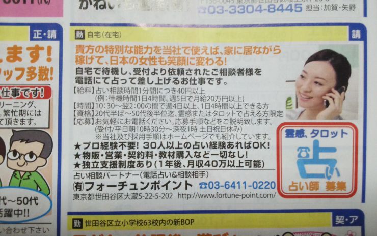 物販・営業・契約料・教材購入など一切なしです。プロ経験不要、30人以上の占い経験があればOKとなっています。給料は占い相談時間1分につき40円以上となっていますので、働き始める際の参考に出来ます。まずはお電話を。