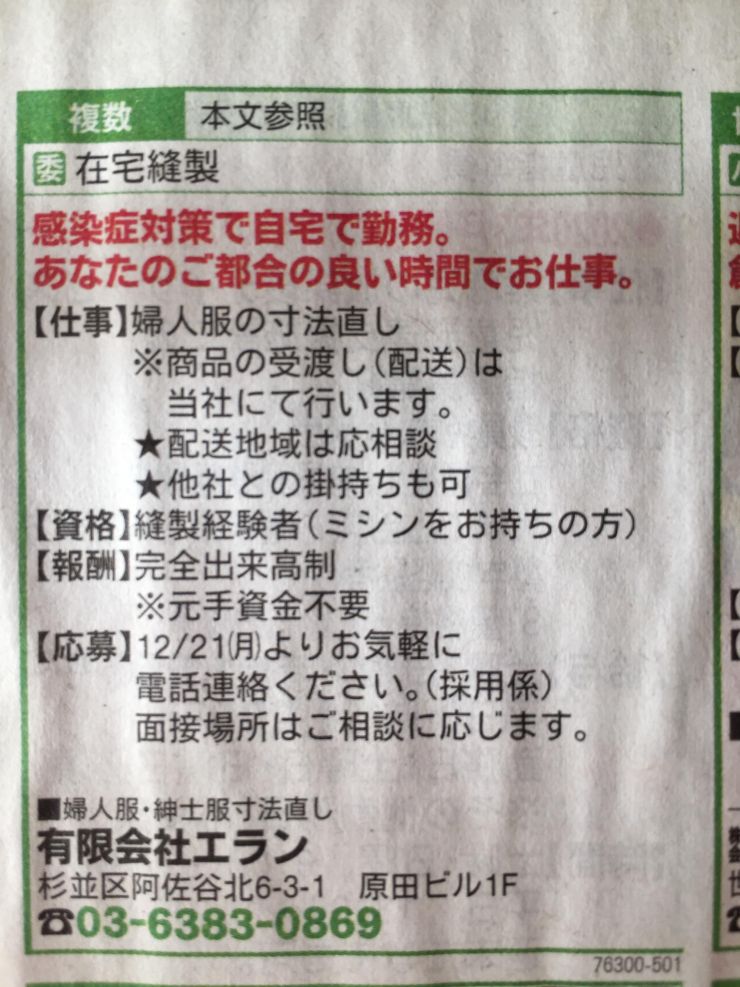 婦人服の寸法直しの、在宅縫製の求人です。縫製経験者(ミシンをお持ちの方)の求人となります。報酬は完全出来高制です。