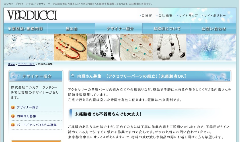 公式サイトへ「株式会社ニシカワ ヴァドゥーチ」の内職について、ホームページの記載内容から、オススメできそうか(安心できそうか)を在宅ワークガイド・スタッフが独自にチェックしました。(2016年1月18日チェック)