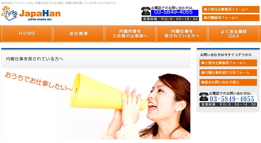 公式サイトへ「株式会社 ジャパンハンズ」の内職について、ホームページの記載内容から、オススメできそうか(安心できそうか)を在宅ワークガイド・スタッフが独自にチェックしました。(2016年1月18日チェック)