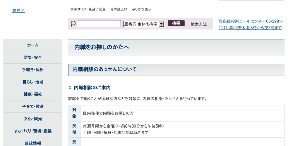 豊島区の公式サイトに掲載されている内職相談のページになります。豊島区では区内に在住の方を対象に内職情報の提供や相談受付、あっせんを行っています。ホームページでは求人情報の公開は行われていないため直接問い合わせる必要があります。また、あっせんを受けるためには登録が必要なので利用を希望する際は忘れずに登録をしてください。