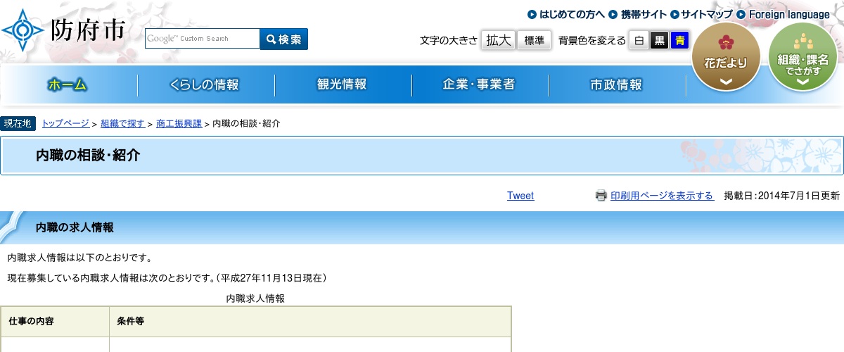 防府市の公式サイトになります。防府市では市役所に内職に関する情報提供と相談受付の窓口があるようです。ホームページには募集中の求人情報が掲載されており、希望する内職を見つけた場合は防府市商工振興課まで問い合わせを行ってください。